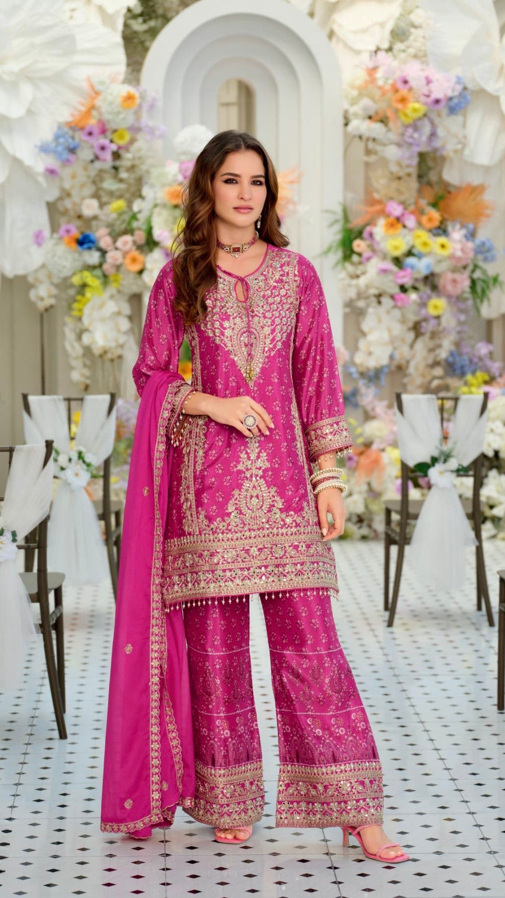 Lightweight Chinon fabric, sparkling real mirror work, shimmering sequins, and intricate gold zari embroidery. Finished with delicate pearl tassels that move with every step.