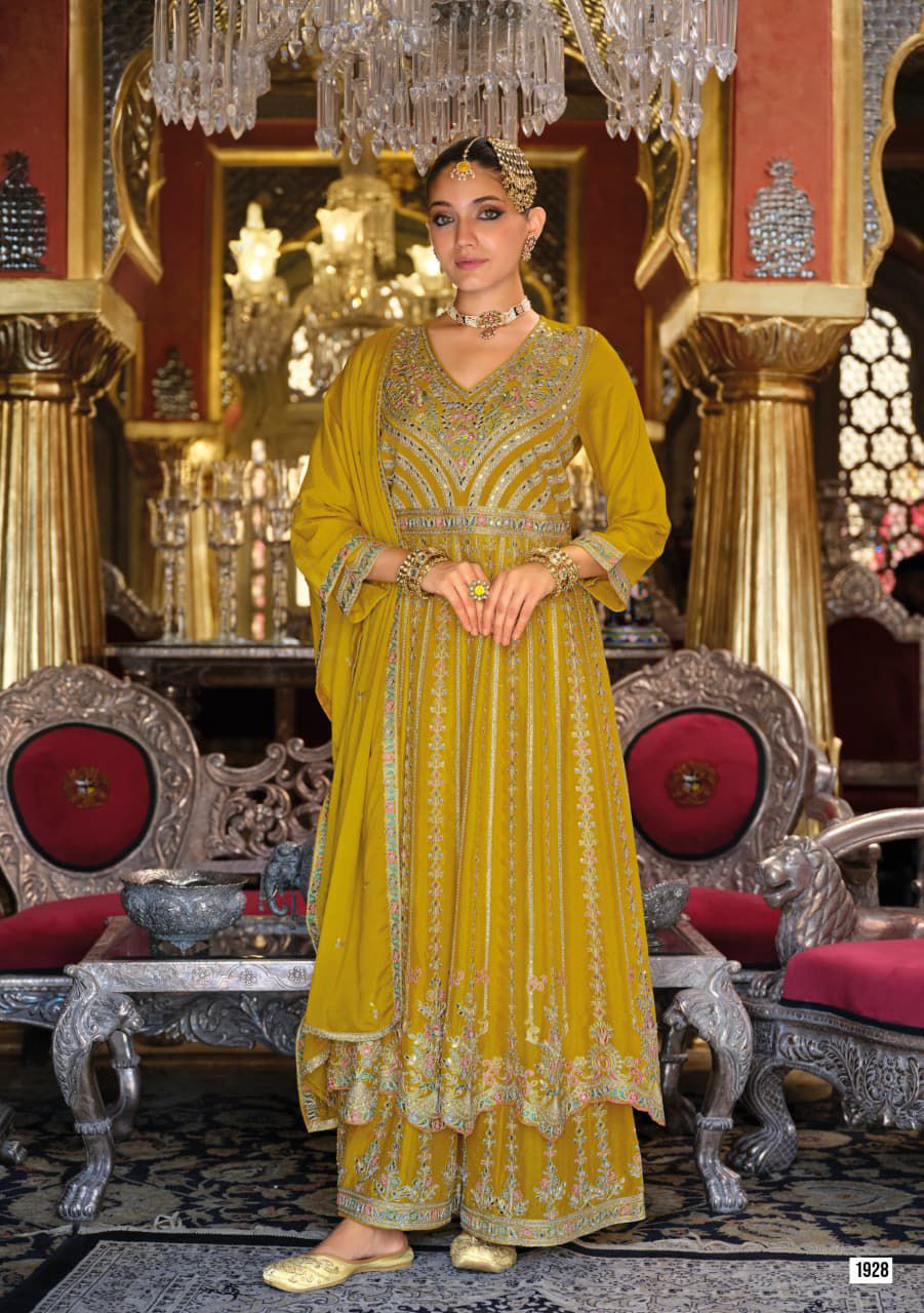 Step into elegance with this breathtaking 3-piece Chinon suit, lavishly adorned with intricate multicolor silk thread embroidery, gold zari detailing, and real mirror work that sparkles with every step.